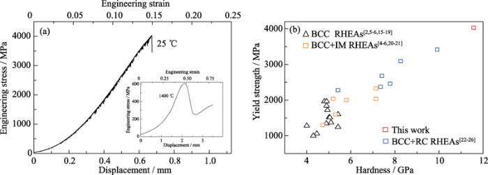 Engineering stress-strain curves of the composite at room temperature and 1400 ℃ (a); Comparison of mechanical properties of the typical refractory HEAs (b)