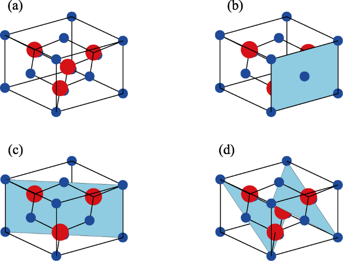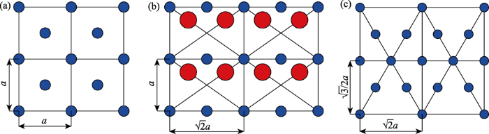 砷化镓(GaAs)作为一种III-V族半导体材料, 属于闪锌矿晶格结构, 单个晶胞结构可以看作是两个面心立方晶格组成, 一个砷晶格和一个镓晶格。若以任一镓原子为空间坐标原点建立坐标系A, a为两相邻顶角原子中心距离, 其四个砷原子的空间坐标分别为(1/4a, 1/4a, 1/4a), (3/4a, 3/4a, 1/4a), (3/4a, 1/4a, 3/4a), (1/4a, 3/4a, 3/4a), 8个镓原子位于在面心立方晶格的8个顶角, 其余6个镓原子位于正六面体的6个面的中心处。砷化镓的各向异性主要表现在如图1所示的三个晶面, 其中镓原子为蓝色, 砷原子为红色。