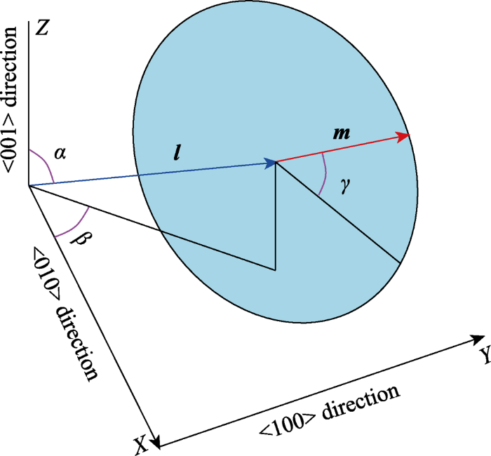 如图3所示, 在空间中建立直角坐标系B, 三个相互垂直的坐标轴分别为X, Y, Z, 假设l为砷化镓空间晶格内任意方向, ${{l}_{1}}$、${{l}_{2}}$、${{l}_{3}}$分别为<100>晶向、<010>晶向、<001>晶向与l方向上的余弦, 其中α是空间向量l与Z轴所形成的夹角, 而β是l在XY平面的投影与X轴的夹角, m为向量l终点且垂直于l向量的平面(此平面记作剪切面)上的任意向量, γ为向量m与向量l所在延长线在剪切面上投影所形成的夹角。利用柔度矩阵得到砷化镓空间晶格内任意方向上的弹性模量只与向量l有关, 可以表示为式(8)[11,12,13,14,15,16,17]:
