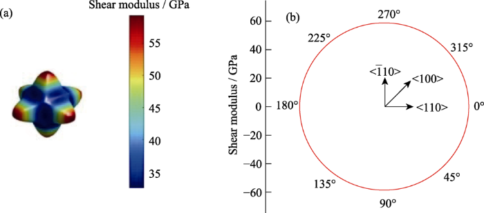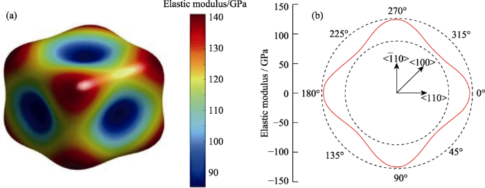 2) 砷化镓空间弹性模量和泊松比以及剪切模量存在高度对称性, 弹性模量最大值为141.16 GPa, 最小值为85.26 GPa, 相差接近39.6%; 剪切模量的最大值为59.4 GPa, 最小值为32.5 GPa, 相差接近45.3%; 泊松比最大值为0.44, 最小值为0.19, 相差接近56.81%, {100}晶面砷化镓弹性模量和泊松比沿着不同晶向呈现4个周期分布, {100}晶面剪切模量沿着不同晶向没有变化, 恒值为59.4 GPa。