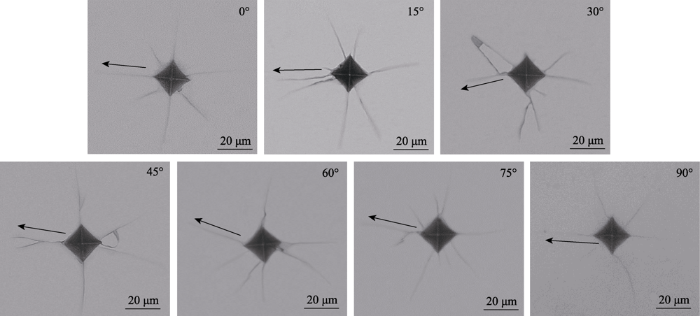 压痕试验是通过压头垂直压入测试材料, 通过分析压头的下压载荷与在样品上形成的压痕特征, 从而计算得出材料的弹性模量、硬度、断裂韧性等相关力学特性。本次压痕试验, 采用HXS-1000Ak维氏压头显微硬度计, 试验所用压头为标准维氏金刚石压头, 压痕特征的观察也在该设备上进行。进行压痕实验时, 首先对{100}晶面为抛光面的砷化镓晶圆片预处理, 使用金刚石刀将砷化镓晶圆片按标定好的晶向进行切割, 方便压痕试验时确定材料的晶向。其中第一次取向为{100}晶面的<110>晶向, 之后逆时针每间隔15°进行一次取向, 共进行7次取向, 然后使用1.961 N的压力进行加载。