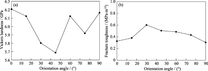 当试验结果满足c/b≥3时, 断裂韧性${{K}_{\text{IC}}}$的值较为准确。其中${{H}_{v}}$为维氏硬度, $F$为施加载荷, b为压痕半对角线长度、c为压痕选取角度对应晶向上的裂纹长度。根据式(20)和式(21)对砷化镓{100}晶面单个周期内的维氏硬度和断裂韧性进行求解。由图8可知: 砷化镓{100}晶面的维氏硬度波动范围较小, 在5.688~6.207 GPa之间, 均值为6.004 GPa, 在<100>晶向上存在最小值5.688 GPa, 在<110>晶向上存在最大值6.207 GPa。砷化镓{100}晶面的断裂韧性波动范围较大, 在0.304~0.602 MPa·m1/2, 均值为0.433 MPa·m1/2, <110>晶向到$<\bar{1}10>$晶向的变化规律为先增大后减小, 在<110>晶向存在最小值0.304 MPa·m1/2, 即{100}晶面上裂纹沿<110>晶向最易扩展。表2为已有相关研究和本次研究结果的汇总比较。