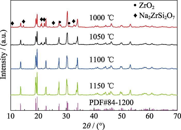 为优化Na3Zr2Si2PO12的烧结温度, 分别在1000、1050、1100和1150 ℃对粉体进行烧结, 不同温度烧结下得到样品的X射线衍射图谱如图1所示。由图可知, 当烧结温度为1000 ℃时Na3Zr2Si2PO12主相已生成, 但存在Na2ZrSi2O7和ZrO2杂相, 并且主相的衍射峰强度弱, 半峰宽较宽, 说明烧结产物结晶性差。当烧结温度为1100 ℃时, ZrO2杂相消失, Na2ZrSi2O7杂相的衍射峰强度减弱, 说明提高烧结温度有利于消除杂相。1100与1150 ℃下烧结产物的衍射峰较1000 ℃烧结产物的衍射峰半峰宽更小, 表明烧结温度越高, 产物的结晶性越好。与1000 ℃烧结产物相比, 1150 ℃烧结产物的衍射峰在2θ= 19.2°, 27.5°和30.5°发生劈裂, 说明材料由离子电导率低的菱形相转变为离子电导率高的单斜相[25,35], 并且衍射峰与标准PDF 84-1200衍射峰吻合, 说明1150 ℃是具有高离子电导率单斜结构的Na3Zr2Si2PO12固体电解质的成相温度。