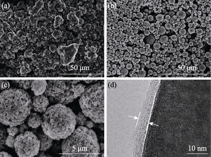 常规混合(a)和喷雾干燥后Na3Zr2Si2PO12颗粒(b~c)的SEM照片, 以及喷雾干燥后Na3Zr2Si2PO12颗粒表面的TEM照片(d)