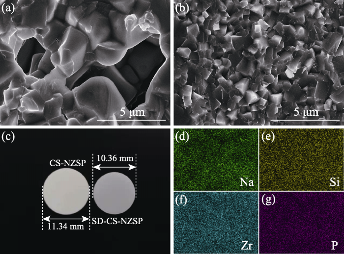 CS-NZSP(a)和SD-CS-NZSP(b) 陶瓷片断面的SEM照片和实物照片(c), 以及(b)的元素分布图(d~g)