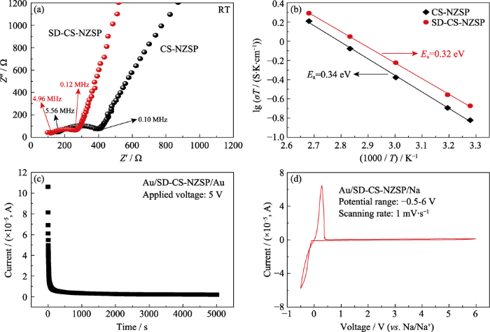 图5(a)为常规烧结法和喷雾干燥法得到的陶瓷片室温电化学阻抗谱(EIS)。图中半圆体现了晶界阻抗和容抗的并联阻抗特性, 半圆的左侧与横坐标的交点代表晶粒的阻值, 半圆在横坐标的跨度反映了晶界的阻值, 半圆后的斜线体现了阻塞电极/电解质界面的阻抗特性[36]。对图4的EIS进行拟合, 可以得到CS-NZSP、SD-CS-NZSP的离子电导率, 实验数据见表4。采用喷雾干燥法得到的SD-CS-NZSP室温离子电导率为6.96×10-4 S∙cm-1, 高于采用常规烧结法得到的CS-NZSP(4.94×10-4 S∙cm-1)。通过对EIS拟合的数据分析可知: 具有更高致密度的SD-CS-NZSP的晶界阻抗更小, 室温离子电导率更高。