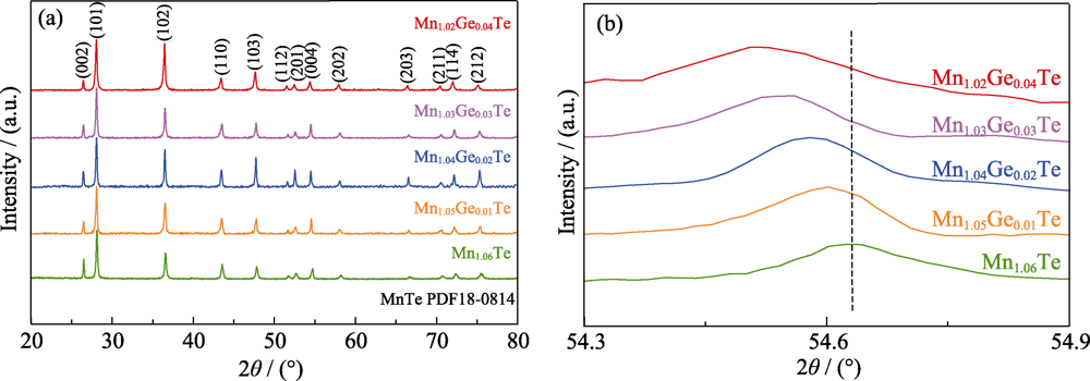| 图1 (a)Mn1.06-xGexTe(x=0~0.04)的XRD图谱, 以及在(b)2θ=54.3°~54.9°范围的放大图 |