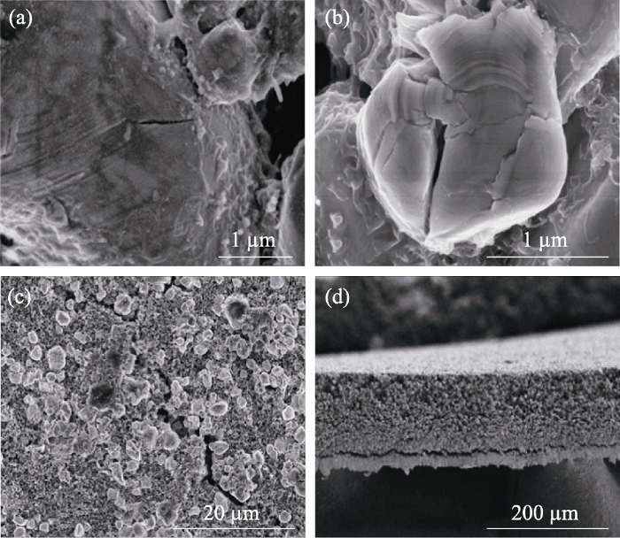 为探究正极材料的失效行为, 对NCM523/Li扣式半电池循环至失效后拆解进行正极材料的离位SEM表征。研究发现正极材料NCM523多次电化学循环后, 在电化学-力学耦合作用下引起的扩散诱导应力使得NCM523发生了多尺度损伤, 出现正极活性材料内部裂纹、活性颗粒破裂或与粘接剂脱粘、活性层与集流体分层等现象(图1 )。