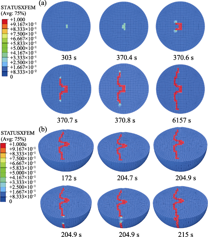 Crack initiation and propagation of active particle of diameter of 3 μm under the current density of 0.37 A/m2[17 ] (a) Lithiation process; (b) Delithiation process. The variable STATUSXFEM presents the status of element, and it varies 0 (non-damage status) or 1 (completely cracked) ...