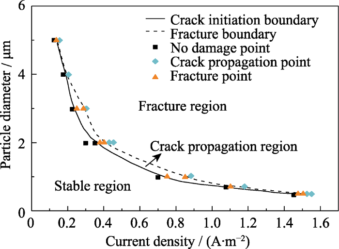 图4 所示.整个裂纹准则图分为三个区域: 断裂区域、裂纹扩展区域和稳定区域.其中黑色实线为不同尺寸颗粒裂纹萌生的临界电流密度, 可以发现活性颗粒的临界电流密度随着颗粒尺寸的增加而减小.通过电化学循环后离位SEM表征结果(