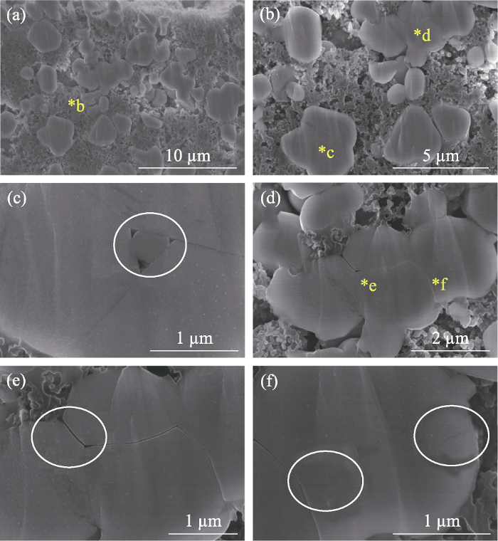 10.15541/jim20210777.F0005 图5 电化学循环后NCM横截面的SEM照片 SEM images of NCM cathode after cyclic charging- discharging test Different magnification SEM images showing the cracks in the big or small paticles ...
