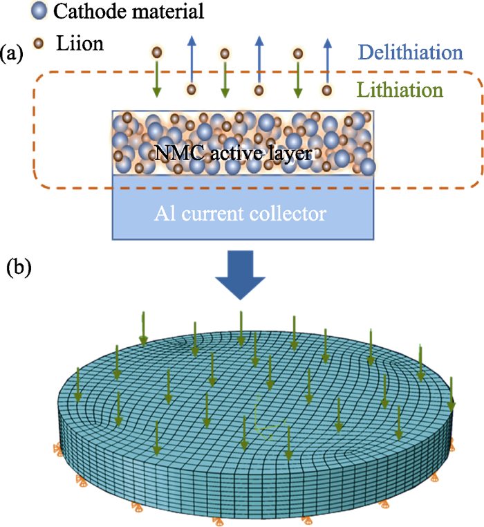 (a) Schematic illustration of electrode during the lithiation/ delithiation process, whereby NCM active layer being coated on the Al current collector, and (b) boundary condition and the load applied to electrode during the lithiation stage[20 ]