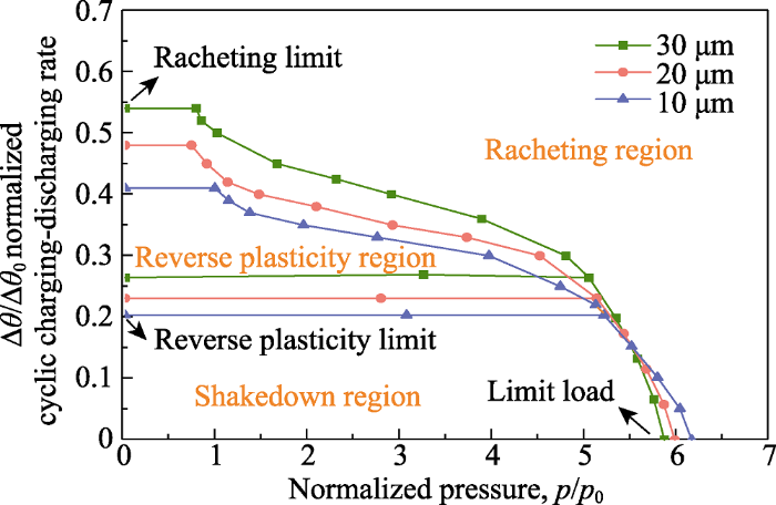 3.2.1 NCM活性层的安定棘轮边界 基于扩散诱导应力的计算方法得到NCM活性层在充放电过程中的扩散诱导应力场, 再通过ABAQUS LMM插件分析, 可以得到NCM活性层的安定棘轮边界.图7 为考虑了厚度影响的NCM极片安定极限和棘轮极限边界, 其中$\Delta \theta /\Delta {{\theta }_{0}}$、$p/{{p}_{0}}$分别是归一化的循环充放电倍率和压力, $\Delta {{\theta }_{0}}$和${{p}_{0}}$的设定均与充放电实验负载条件一致.值得注意的是, 反向塑性极限与棘轮极限都随着活性层厚度增加而增大, 这说明在循环扩散诱导应力下较薄的活性层更危险. ...