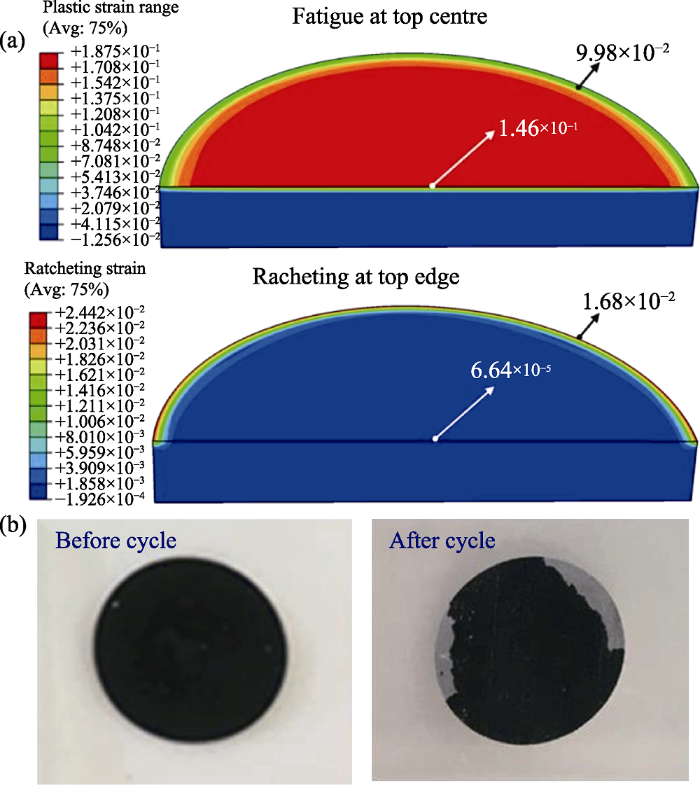-2 ,位于边缘.这表明正极的上表面中心表现出疲劳破坏, 而由于塑性应变积累, 上表面的边缘表现出棘轮行为.因此, 裂纹萌生和扩展主要发生在正极活性层中心, 而边缘塑性变形累积会引发棘轮现象, 导致活性层边缘形成渐增性塑性垮塌.