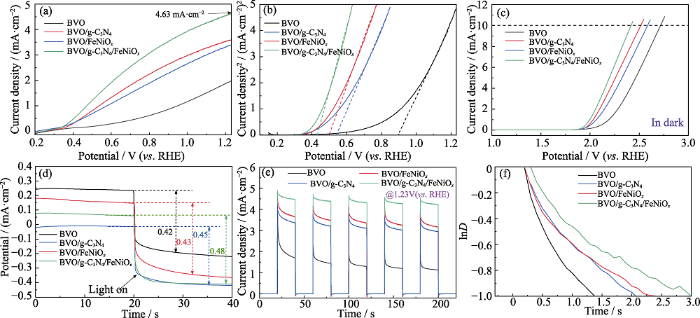 图6(a)为BVO、BVO/g-C3N4、BVO/FeNiOx、BVO/g-C3N4/FeNiOx电极的线性扫描伏安法(LSV)曲线。在无空穴捕获剂的情况下, 以0.1 mol/L 硼酸钾为电解液, 测得BVO/g-C3N4/FeNiOx的PEC水氧化光电流高达4.63 mA∙cm-2 (1.23 V (vs. RHE)), 是BVO/FeNiOx (3.55 mA∙cm-2)的1.30倍, BVO/g-C3N4 (3.41 mA∙cm-2)的1.35倍, 纯BVO (1.86 mA∙cm-2) 的2.48倍。负载了FeNiOx催化剂后光电流明显提升, 尤其是在低偏压条件下, 这是由于FeNiOx里的Fe、Ni两个元素通过价态转化(Fe2+(Ni2+)→Fe3+(Ni3+)→Fe2+(Ni2+))将电极表面的空穴快速转移到电解液中, 从而改善水氧化动力学。Kim等[28]指出, BVO和OEC材料之间的界面屏障会阻碍空穴迅速转移到电解液表面, 因此在NiOOH和BVO之间插入FeOOH作为空穴传输层, 以促进空穴转移。针对这一缺陷, 在BVO和FeNiOx层之间负载厚度合适的二维g-C3N4纳米片, 与BVO形成p-n异质结就可以很好地解决光生电子和空穴分离效果差的缺陷。Butler曲线(图6(b))是对LSV曲线进行平方处理, 从而得到更精确的光电流起始位点。BVO/g-C3N4/FeNiOx电极的起始电位相对于BVO负移了480 mV, 证明g-C3N4促进了光生电子-空穴分离, 从而增强光电化学催化性能[29]。