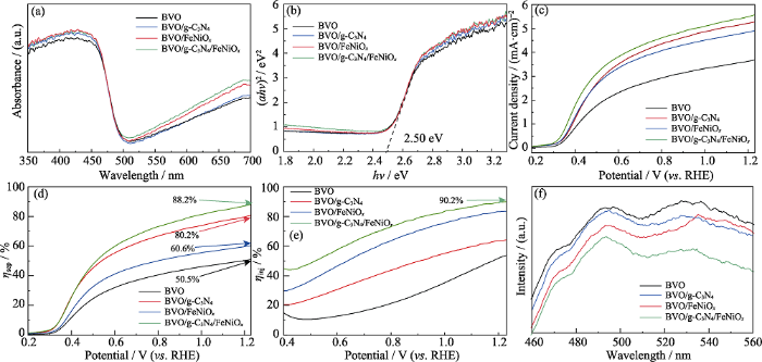 式中, JNa2SO3和JH2O分别为在含和不含Na2SO3空穴捕获剂情况下测得的光电流密度(mA∙cm-2)。如图7(e)所示, 在1.23 V (vs. RHE)电位下, BVO/g-C3N4/FeNiOx和BVO/FeNiOx的ηinj明显高于BVO/g-C3N4和BVO。这说明负载FeNiOx后, 空穴更容易从电极表面注入到电解液中。电极的ηinj和ηsep说明g-C3N4与BVO形成的p-n异质结可以促进光生电荷分离, 抑制电荷复合, 但是对表面催化动力学提升有限; 而FeNiOx催化剂的作用是通过自身价态转变将薄膜电极表面更多的光生空穴注入到电解液中, 参与水氧化。g-C3N4和FeNiOx协同修饰后, BVO/g-C3N4/FeNiOx光阳极的ηinj达到90.2%, ηsep达到88.2%。