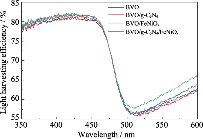 为了进一步研究样品的催化活性, 测量了BVO、BVO/g-C3N4、BVO/FeNiOx、BVO/g-C3N4/FeNiOx电极在黑暗环境下的LSV曲线。如图6(c)所示, 复合g-C3N4和FeNiOx层后, 暗电流向负方向偏移, 可以获得更低的过电位和更大的水氧化电流密度, 这是由于异质结和助催化剂可以促进电荷分离以及将空穴加速注入电解液中, 可以增加活性位点以及增强光催化活性[12]。除此之外, 对电极进行开路电压(OCP)测试(图6(d)), 在开灯的瞬间, 半导体产生光生电子-空穴, 空穴在光阳极表面聚集, 电子通过外部电路传输到对电极的铂片上, 则在两个电极间产生了由光驱动的光电压。光电压越大则催化活性和催化驱动力则越强。图中可以看出, 各个电极的光电压大小为BVO/g-C3N4/FeNiOx (480 mV)>BVO/FeNiOx (450 mV)>BVO/g-C3N4 (430 mV)>BVO (420 mV), 由g-C3N4和FeNiOx协同催化的电极有最强的催化动力学。
