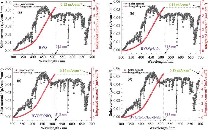 综上所述, 本研究通过简单的浸渍法在BVO表面复合一层p型g-C3N4半导体材料, 构成的p-n异质结可以有效抑制载流子复合, 增强光生电荷分离, 电荷分离效率提升至80.2%。进一步地, 异质结表面包覆的FeNiOx催化剂, 可以缓解表面催化动力学差的问题, 同时也隔绝了BVO与电解液的接触, 起到了表面钝化、防止光腐蚀的效果。双重催化剂协同修饰的BVO/g-C3N4/FeNiOx光阳极在AM 1.5 G光照下的光电流密度达4.63 mA·cm−2 (1.23 V (vs. RHE)),是BVO电极(1.86 mA∙cm−2)的2.54倍。电荷分离效率达到了88.2%, 是BVO电极(50.5%)的1.75倍。本工作为光阳极的制备提供一种新的思路与方案。