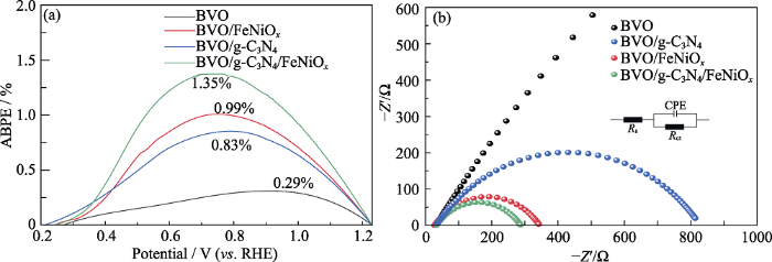 式中, I为在偏置电压下获得的光电流密度(mA∙cm-2), VRHE为应用偏置电压(V), Plight为入射光照强度(100 mW·cm-2)。ABPE可定量分析电极的太阳能转换效率, 由图8(a)可知, 在模拟AM 1.5G光照下, BVO/g-C3N4/FeNiOx光阳极的最大ABPE为1.35% (0.73 V (vs. RHE)), 与BVO (0.29%)、BVO/g-C3N4 (0.83%)和BVO/FeNiOx (0.99%)相比明显增强。最大ABPE对应的电位也发生了负移, 表明较低的外加电位能最大程度地提高光激活材料的PEC性能[35]。这些结果证明集成的BVO/g-C3N4/FeNiOx光阳极提高了用于PEC水分解的太阳能转换效率。