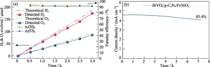 (a)Gas evolutions detected by gas chromatography and Faradaic efficiency for BVO/g-C3N4/FeNiOx and (b) stability curve of BVO/g-C3N4/FeNiOx