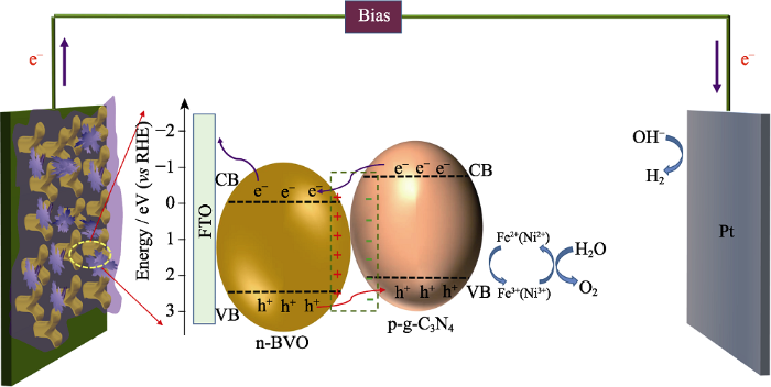 超薄的g-C3N4和BVO具有匹配的能带结构, 它们在太阳辐射下都能被激发产生光生电子-空穴。由图5(a, b)的M-S曲线可以得到g-C3N4和BVO的平带电位分别为1.68和0.27 eV。基于能带理论[37], BVO/g-C3N4/FeNiOx光阳极光生电荷转移机理如图10所示。g-C3N4和BVO构建了Ⅱ型p-n异质结, 在p-n内建电场的驱动下, 空穴从BVO的价带迁移到g-C3N4的价带, 然后通过FeNiOx催化剂中元素价态的转化(Fe2+(Ni2+)→Fe3+(Ni3+)→Fe2+(Ni2+))电极表面的空穴传输到电解液中, 将OH-氧化成O2。并且由于异质结内建电场的作用, 产生的光生电子从 g-C3N4的导带转移到BVO的导带, 再流向FTO, 通过外部电路转移到Pt对电极上, 把电解液中的H+还原成H2。