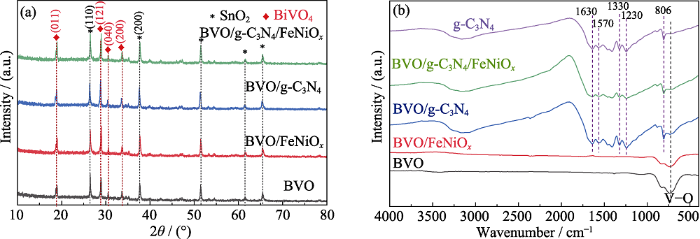 为了研究不同催化剂合成的晶格结构, 对不同电极BVO, BVO/FeNiOx, BVO/g-C3N4, BVO/g-C3N4/FeNiOx进行X射线衍射(XRD)分析, 如图2(a)所示。除FTO中的SnO2外, XRD谱图中的衍射峰均来自单斜BVO (JCPDS#14-0688)[15]。所有BVO基光阳极薄膜均结晶度良好, 表明450 ℃煅烧后BiOI完全转化为BVO。BVO/g-C3N4复合电极的XRD谱图与BVO基本相同, 由图S1的XRD谱图可知合成了高纯度的二维g-C3N4纳米片(JCPDS#87-1526)[18]。造成这一现象的原因可能是因为g-C3N4负载较少而导致信号较弱。BVO/FeNiOx, BVO/g-C3N4/FeNiOx复合电极的XRD谱图与BVO和BVO/g-C3N4电极也基本相同, 说明FeNiOx助催化剂可能以非晶的形式存在[21]。