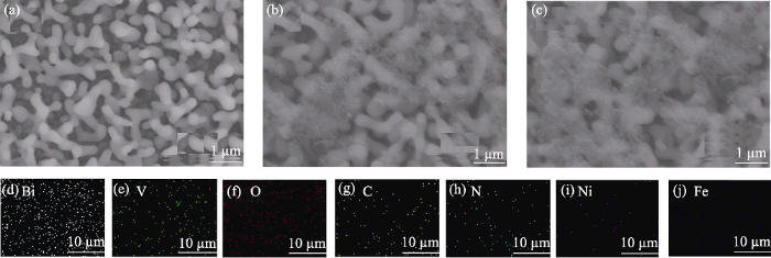 (a) BVO, (b) BVO/g-C3N4, (c) BVO/g-C3N4/FeNiOx 的SEM照片及(d~j)BVO/g-C3N4/FeNiOx的EDS能谱