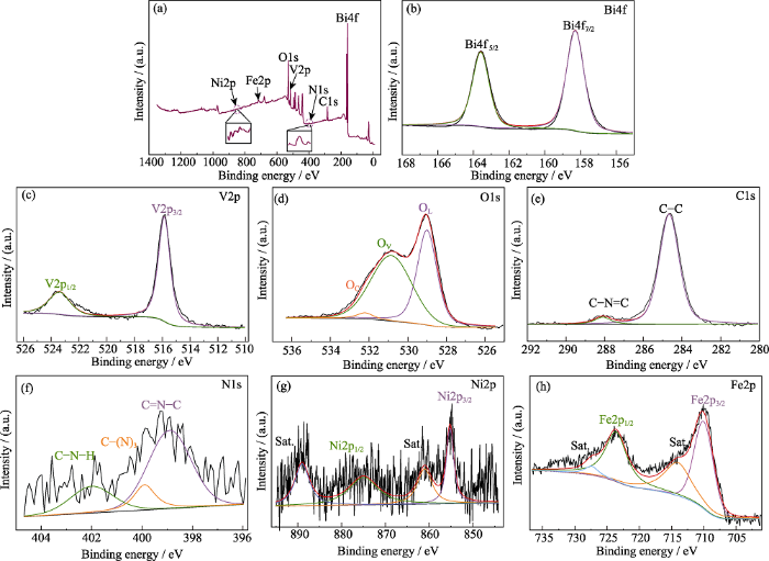 (a) Total survey and (b) Bi4f, (c) V2p, (d) O1s, (e) C1s, (f) N1s, (g) Ni2p, (h) Fe2p high resolution spectra