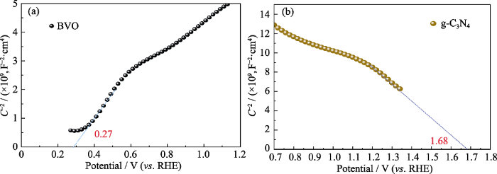 (a) BVO和(b) g-C3N4电极的莫特-肖特基(M-S)曲线