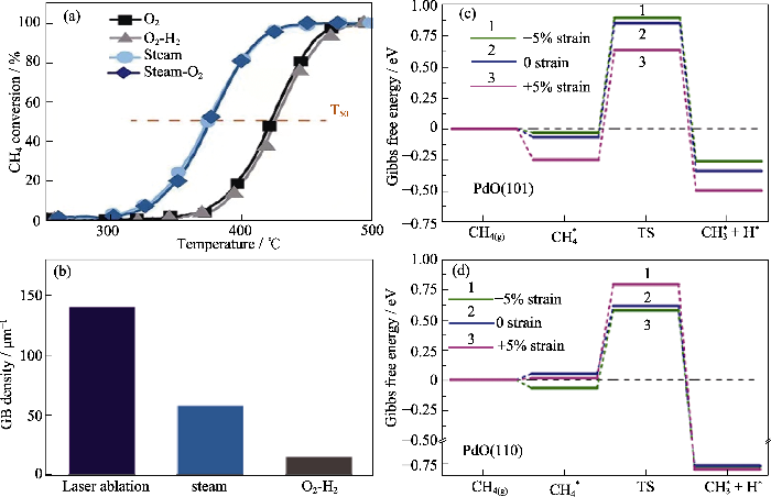 (a) Light-off curves and T50 values of Pd/Al2O3 after O2 (600 ℃), O2-H2, steam (600 ℃), and steam-O2 pretreatments; (b) GB density statistical histogram of laser-generated Pd/Al2O3 and Pd/Al2O3 after steam (600 ℃) and O2-H2 pretreatments; (c, d) Calculated free energy diagrams for breaking the first C-H bond in CH4 on PdO(101) and PdO(110), respectively. Reprinted from Ref. [28] with permission, Copyright 2021 AAAS ...