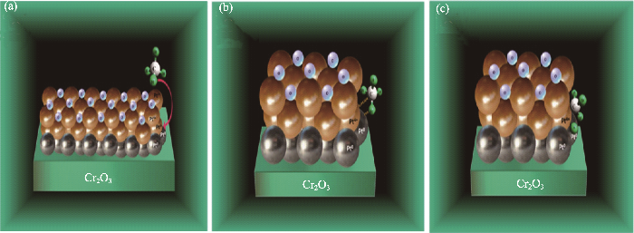 (a) Reactants: CH4 in the gas phase and 1% Pt/Cr2O3; (b) CH4 polarization by Pt0−Pt4+ site and formation of a transition state; (c) Abstraction of the first hydrogen on the adsorbed CH4 molecule