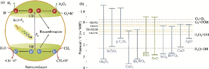 (a) Schematic diagram of methane activation over semiconductor-based photocatalysts[1]; (b) Schematic diagram of band structures of commonly used semiconductors and redox potentials of different reactants[55]