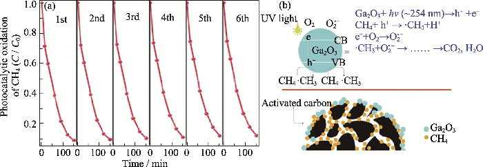 ... (a) Recycled test of photocatalytic oxidation of CH4 over 15% Ga2O3/AC; (b) Proposed mechanism for photocatalytic oxidation of CH4 over Ga2O3/AC composites. Reprinted from Ref. [60] with permission, Copyright 2017 Royal Society of Chemistry ...