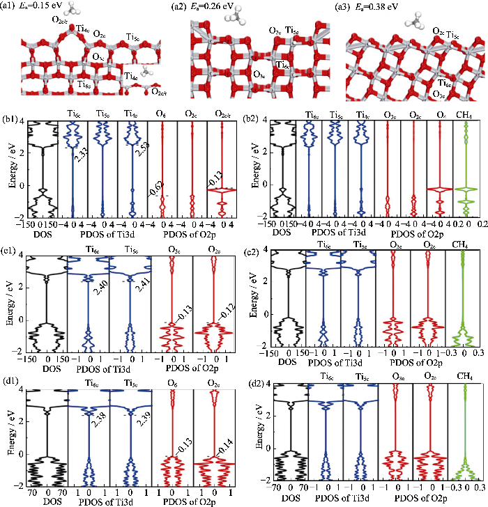 (a1-a3) Most stable adsorption configurations of CH4 on (a1) anatase TiO2(001)-(1×4), (a2) anatase TiO2(100)-(1×2), and (a3) anatase TiO2(101) surfaces. Gray and red balls represent Ti and O atoms, respectively; (b1, b2, c1,c2, d1, d2) Calculated PDOS of (b1) bare and (b2) CH4-adsorbed anatase TiO2(001)-(1×4) surfaces, (c1) bare and (c2) CH4-adsorbed anatase TiO2(100)-(12) surfaces, and (d1) bare and (d2) CH4-adsorbed anatase TiO2-(101) surfaces. Reprinted from Ref. 61 with permission, Copyright 2022 American Chemical Society