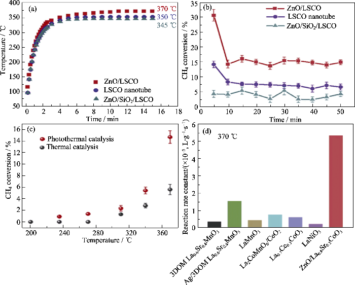 ... (a) Temperature profiles on these monolithic catalysts under irradiation of Xe lamp; (b) CH4 photothermal conversions over these monolithic catalysts under Xe lamp irradiation; (c) Comparison of CH4 conversion for ZnO/LSCO under Xe lamp irradiation and direct thermal heating (furnace) at the same temperature; (d) Activity comparison of methane oxidation with previous studies by normalized reaction rate constant. Reprinted from Ref. [70] with permission, Copyright 2008 American Chemical Society ...