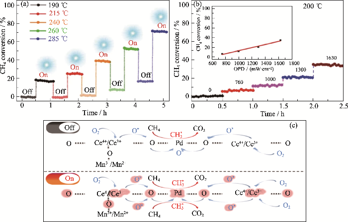 ... (a) Cycling stability test of HPMC; (b) Methane conversion measured at 200 ℃ with different optical power (OPD); (c) Reaction mechanism of HPMC catalyzed methane combustion. Reprinted from Ref. [71] with permission, Copyright 2021 Wiley ...