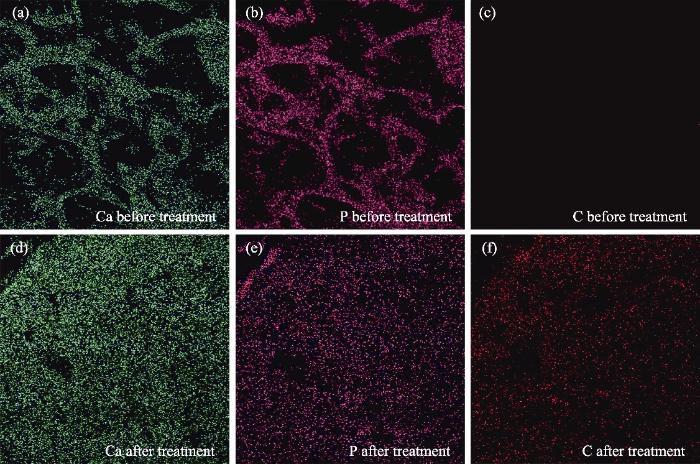 (a, d) Ca; (b, e) P; (c, f) C, corresponding to