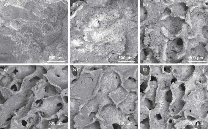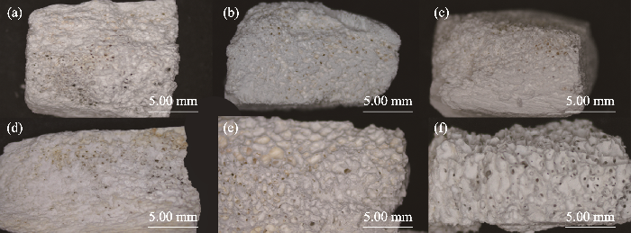 Morphologies of fragile bone samples after consolidation treatments with mass ratios of calcium oxide to calcium hydrogen phosphate at 1 : 1 (a), 1 : 3 (b), 1 : 4 (c), 1 : 5 (d), 1 : 6 (e) and 1 : 7 (f), respectively