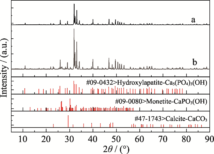研究采用氧化钙与磷酸氢钙混合物在乙醇中的悬浮分散液作为脆弱骨质文物的加固剂, 获得了良好的加固效果。设计这种保护方法基于以下三点:首先, 在乙醇中, 氧化钙和磷酸氢钙不会发生反应, 保证了其悬浮分散液的稳定性;其次, 乙醇的表面张力(0.0223 N/m)较低, 常温下还不到水(0.0727 N/m)的1/3, 使氧化钙和磷酸氢钙的混合物更容易渗入骨质文物内部;再次, 氧化钙和磷酸氢钙间反应本质上是离子反应, 蒸馏水是这类反应的良好介质, 可促进反应物电离出钙离子、磷酸根离子和氢氧根离子, 并生成羟基磷灰石连续相。该磷灰石连续相通过填充、弥合脆弱骨中的孔隙和裂缝, 使破碎的脆弱骨块重新结合而起到加固作用。另外, 羟基磷灰石中Ca/P摩尔比为1.67[38]。故以氧化钙和磷酸氢钙作为羟基磷灰石前驱物时, 两者的摩尔比应为2 : 3, 折合为质量比为1 : 3.5。本研究中氧化钙和磷酸氢钙的最佳配比为1 : 3, 说明此时氧化钙略微过量。这部分过量的氧化钙与水和空气中二氧化碳反应会进一步生成CaCO3, 起到协同加固的作用[39]。