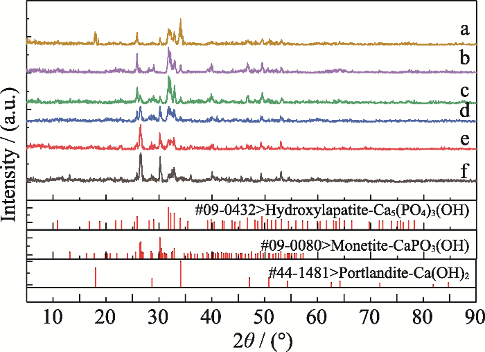 Ratios of calcium oxide to calcium hydrogen phosphate in line(a-f) are 1 : 1, 1 : 3, 1 : 4, 1 : 5, 1 : 6 and 1 : 7, respectively