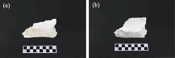 发掘出土风化脆弱骨片的加固效果见图15。加固处理前该骨片疏松多孔, 已经有酥粉脱落。采用1 : 3配比的氧化钙-磷酸氢钙悬浮液, 以表面刷涂方式加固处理后, 脆弱骨片中的孔隙得到有效填充, 脆弱骨片的整体强度也得到明显提高, 不再有酥粉脱落现象。