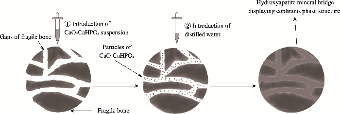 将氧化钙-磷酸氢钙的乙醇分散液分别以滴渗、涂刷、浸泡的方式引入脆弱骨样品内部。然后, 使用蒸馏水对脆弱骨样品进行二次渗透处理, 使氧化钙、磷酸氢钙发生反应生成羟基磷灰石连续相而达到加固的目的。
