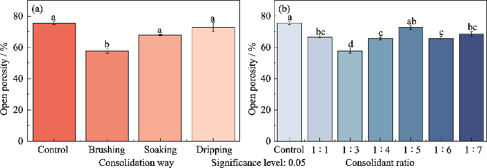 脆弱骨样品孔隙率采用水浸法测试。由图5(a)可知, 加固剂中氧化钙和磷酸氢钙的配比为1 : 3时, 三种施加方式均能减小脆弱骨样品的开放孔隙率, 并以刷涂方式最为显著。这与质量变化分析中样品质量增长的规律一致, 说明孔隙率降低是加固剂进入脆弱骨内部的直接结果。