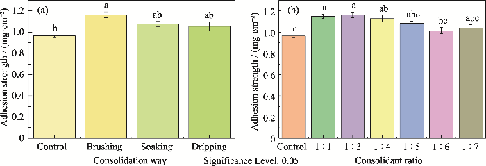 其中, ΔE为色差, L为亮度值, a为黄绿值, b为黄蓝值。利用孔隙率测试仪(MZ-C300, 秒准科技(深圳)有限公司)测得样品开放孔隙率(PO)、密度(SG);通过样品断面的胶带试验(STT)测定加固后样品的强度, 加固强度(Strength, Str)按下式计算: