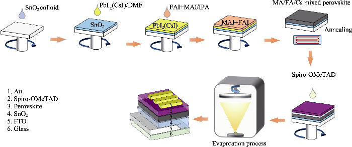 Cs0.05MA0.35FA0.6PbI3钙钛矿薄膜(CMFP): 添加适量1.0 mol/L CsI溶液(DMSO为溶剂)到PbI2溶液中, 其他制备条件与MA0.4FA0.6PbI3钙钛矿相同, 得到的薄膜标记为CMFP。