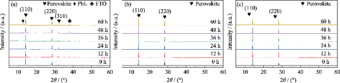 在(20±5) ℃, 相对湿度80%~90%条件下三种钙钛矿薄膜随时间变化的XRD图谱