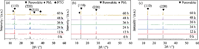 在85 ℃, 相对湿度20%~30%条件下, 三种钙钛矿薄膜随时间变化的XRD图谱