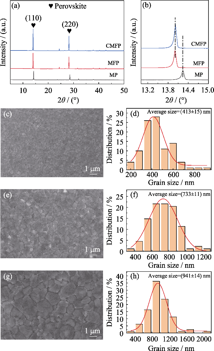 (a) XRD patterns; (b) Locally magnified XRD patterns in the range of 2θ=12.8°-15°; (c, e, g) SEM images and (d, f, h) Statistical distributions of grain diameter for (c, d) MP, (e, f) MFP, and (g, h) CMFP