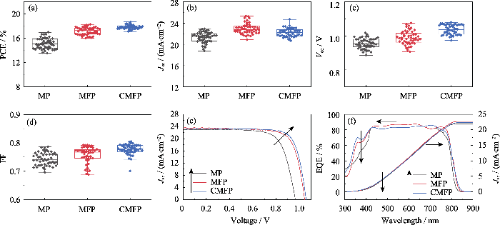 图3(a~d)和表1显示, 掺杂FA+使MFP平均Jsc由21.32 mA•cm-2(MP)提高到22.94 mA•cm-2, 而平均Voc和FF分别从0.95 V和0.74增大到0.99 V和0.76, PSCs的平均PCE从15.11%提高到17.18%。掺杂Cs+使CMFP的平均PCE进一步提高到17.82%, 这主要归因于电池的Voc和FF得到了提高, CMFP的最大PCE为19.34%。图3(f)是三种电池的外量子效率(EQE)测试曲线, 可以用于校准短路电流密度。通过EQE图谱(图3(f))得到的MP、MFP和CMFP电池的积分电流密度分别为21.87、22.71和22.37 mA·cm-2, 与J-V测试(图3(e))得到的Jsc(22.87、23.48、23.30 mA·cm-2)相差不大, 说明测试结果较准确。