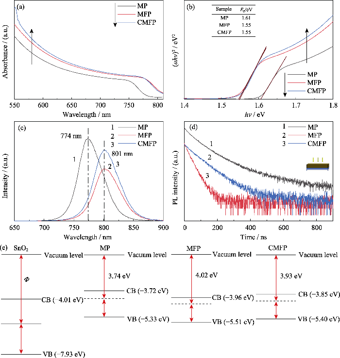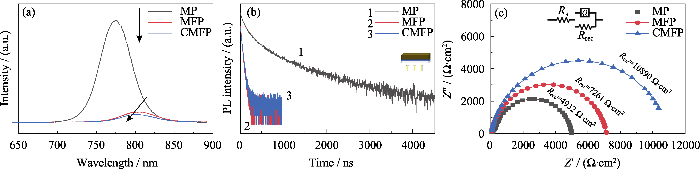 透过FTO激发进行PL和TRPL测试(图5(a, b)), 拟合结果(表S4)能够反映电子从钙钛矿层传输到SnO2的速率, 即电子的抽取速率。CMFP、MFP和MP的